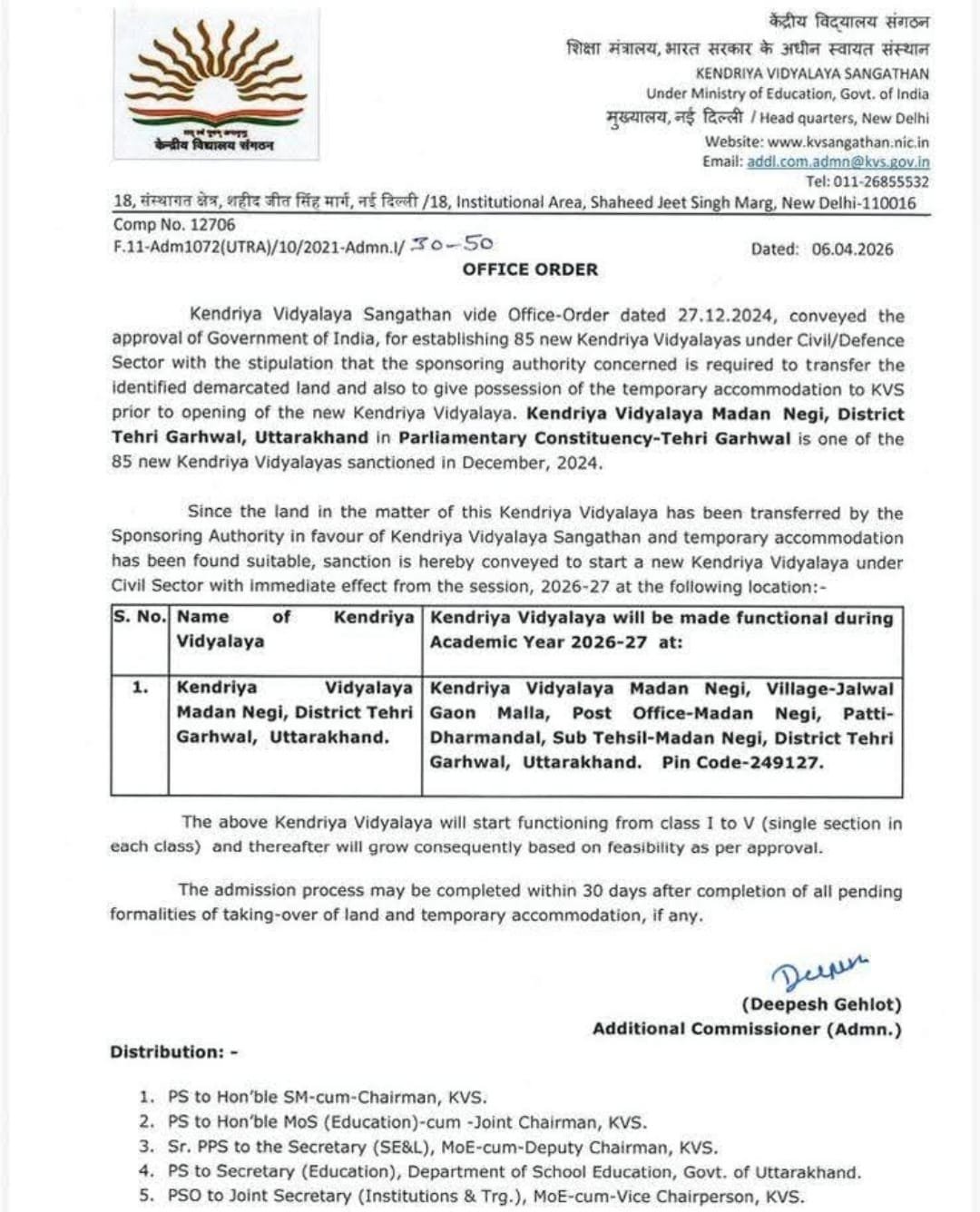 गौरतलब है कि यह निर्णय भारत सरकार की पूर्व स्वीकृति के क्रम में लिया गया है, जिसके तहत देशभर में 85 नए केन्द्रीय विद्यालय खोले जाने हैं। मदान नेगी, टिहरी गढ़वाल स्थित यह विद्यालय उन्हीं स्वीकृत विद्यालयों में शामिल है।