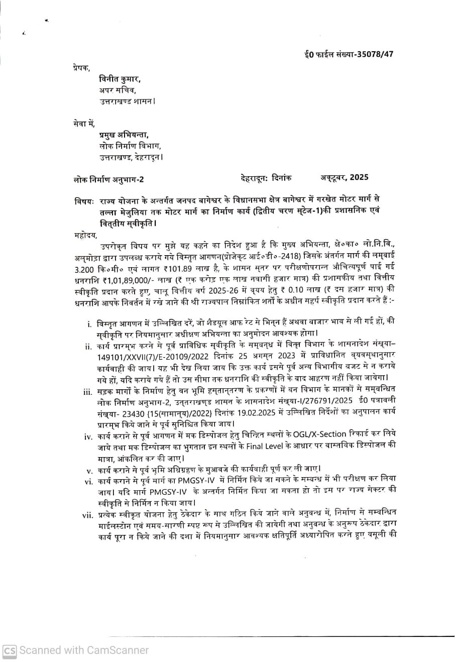 विधायक बागेश्वर पार्वती दास ने बताया कि मुख्यमंत्री पुष्कर सिंह धामी द्वारा बागेश्वर विधानसभा क्षेत्र के लिए राज्य योजना के अंतर्गत गढखेत मोटर मार्ग से तल्ला मेजुलिया तक 3.2 किलोमीटर लंबे मोटर मार्ग के निर्माण कार्य को वित्तीय स्वीकृति प्रदान की गई है। यह कार्य ₹1.01 करोड़ (एक करोड़ एक लाख नवासी हजार रुपये) की लागत से किया जाएगा।