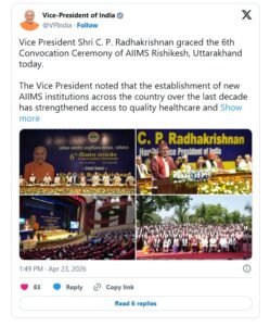 उपराष्ट्रपति सी.पी. राधाकृष्णन ने ऋषिकेश स्थित अखिल भारतीय आयुर्विज्ञान संस्थान ऋषिकेश के छठे दीक्षांत समारोह को संबोधित करते हुए इसे छात्रों के लिए जिम्मेदारी और नए जीवन चरण की शुरुआत बताया। उन्होंने ऋषिकेश को आध्यात्मिक और वैश्विक चिकित्सा-चिंतन का केंद्र बताते हुए कहा कि यहां का वातावरण इस अवसर की गंभीरता को और बढ़ाता है।