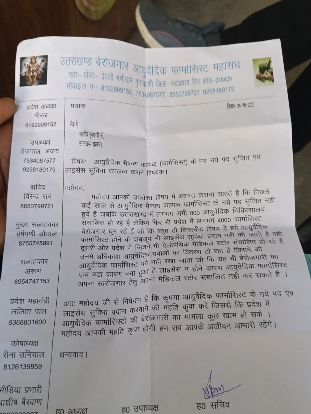 देहरादून में प्रदेश में हजारों आयुर्वेदिक फार्मासिस्टों को लंबे समय से रोजगार और लाइसेंस संबंधी सुविधा नहीं मिल पाने के कारण वे बेरोजगारी का सामना कर रहे हैं। प्रदेश में वर्तमान में लगभग 100 आयुर्वेदिक मेडिकल स्टोर संचालित हैं, जबकि लगभग 4000 प्रशिक्षित आयुर्वेदिक फार्मासिस्ट रोजगार के लिए भटक रहे हैं। वहीं उत्तराखंड बेरोजगार आयुवैदिक फार्मासिस्ट महासंघ ने ज्ञापन दिया जिसमें मांग की है।