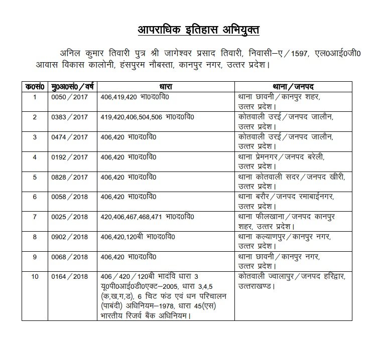 जांच के दौरान खुलासा हुआ कि कंपनी ने निवेश के नाम पर विभिन्न बॉन्ड और सर्टिफिकेट जारी कर करीब ₹12.26 लाख की धोखाधड़ी की। कंपनी के संचालक अनिल कुमार तिवारी और देवेंद्र प्रकाश तिवारी की संलिप्तता धोखाधड़ी और निक्षेपक हित संरक्षण अधिनियम सहित अन्य संबंधित धाराओं में पाई गई। दोनों अभियुक्तों पर ₹50,000-50,000 का इनाम घोषित था तथा इनके खिलाफ कुल 10 आपराधिक मामले दर्ज हैं।