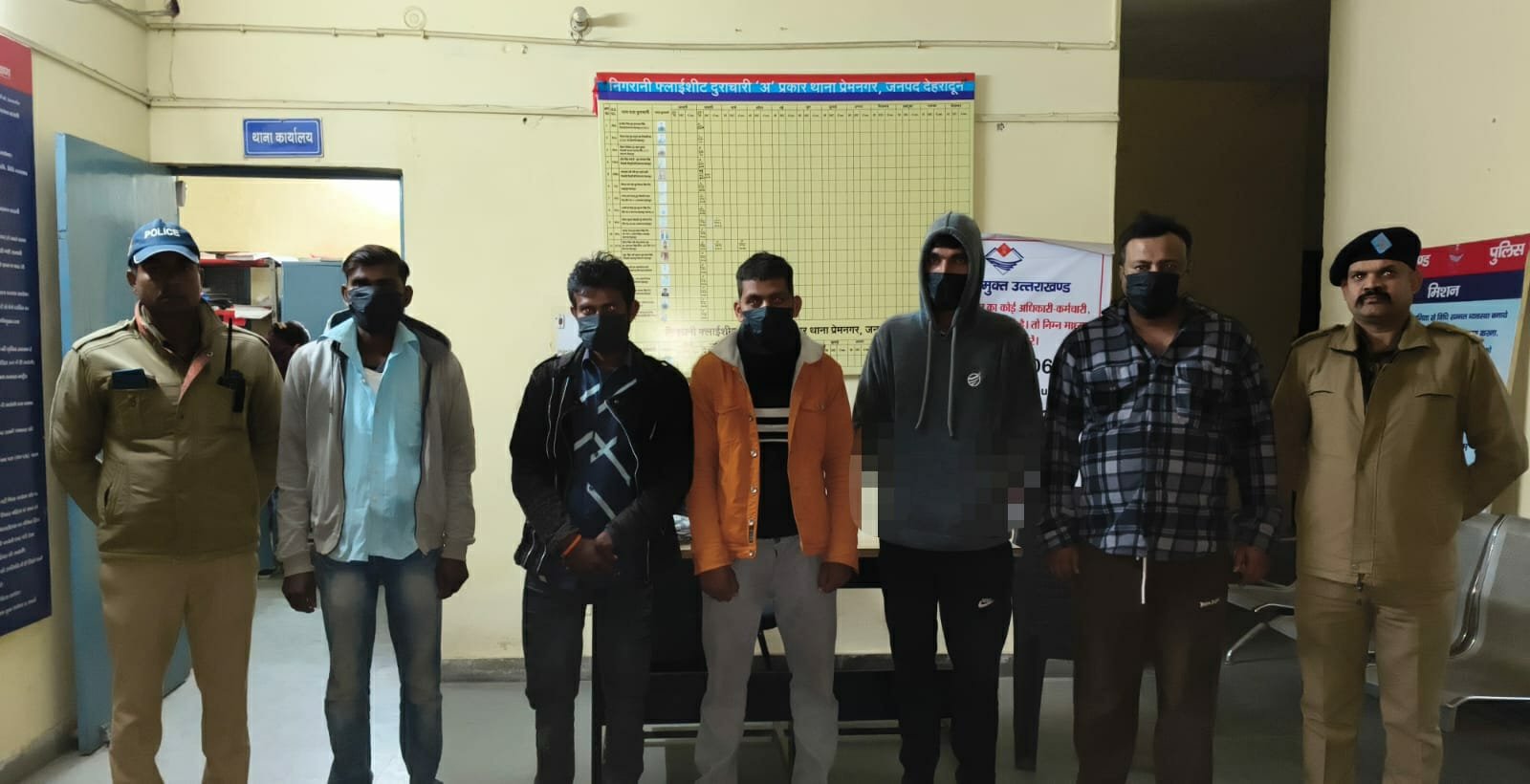 हिरासत में लिए गए व्यक्तियों में राजेश कुमार, सूरज लोहान, सचिन, प्रीतम सिंह और जितेंद्र पंडित शामिल हैं। वरिष्ठ पुलिस अधीक्षक देहरादून ने ऐसे मामलों पर सख्त कार्रवाई के निर्देश दिए हैं।