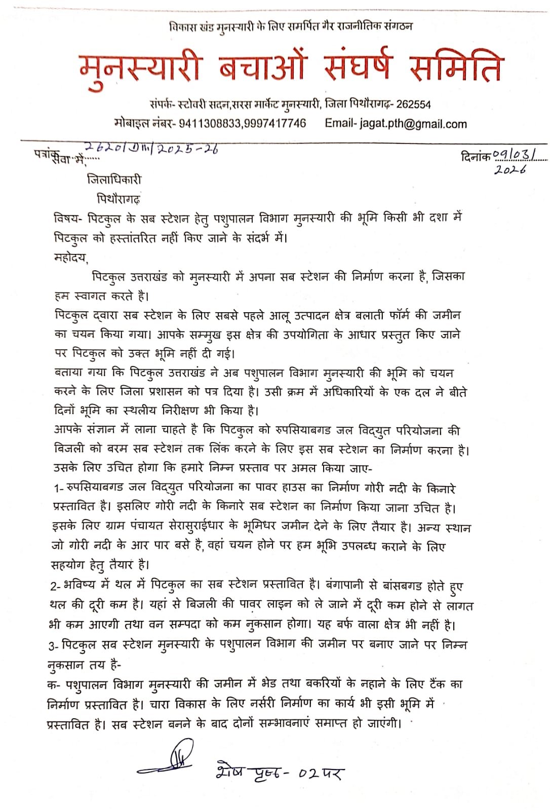 मुनस्यारी के नस्यारी क्षेत्र में पशुपालन विभाग की जमीन पर पिटकुल का सब स्टेशन बनाए जाने के प्रस्ताव का विरोध तेज हो गया है। शुक्रवार को पूर्व जिला पंचायत सदस्य और मुनस्यारी बचाओ संघर्ष समिति के संयोजक जगत मर्तोलिया ने जिलाधिकारी आशीष कुमार भटगांई से मुलाकात कर इस पर आपत्ति जताई।