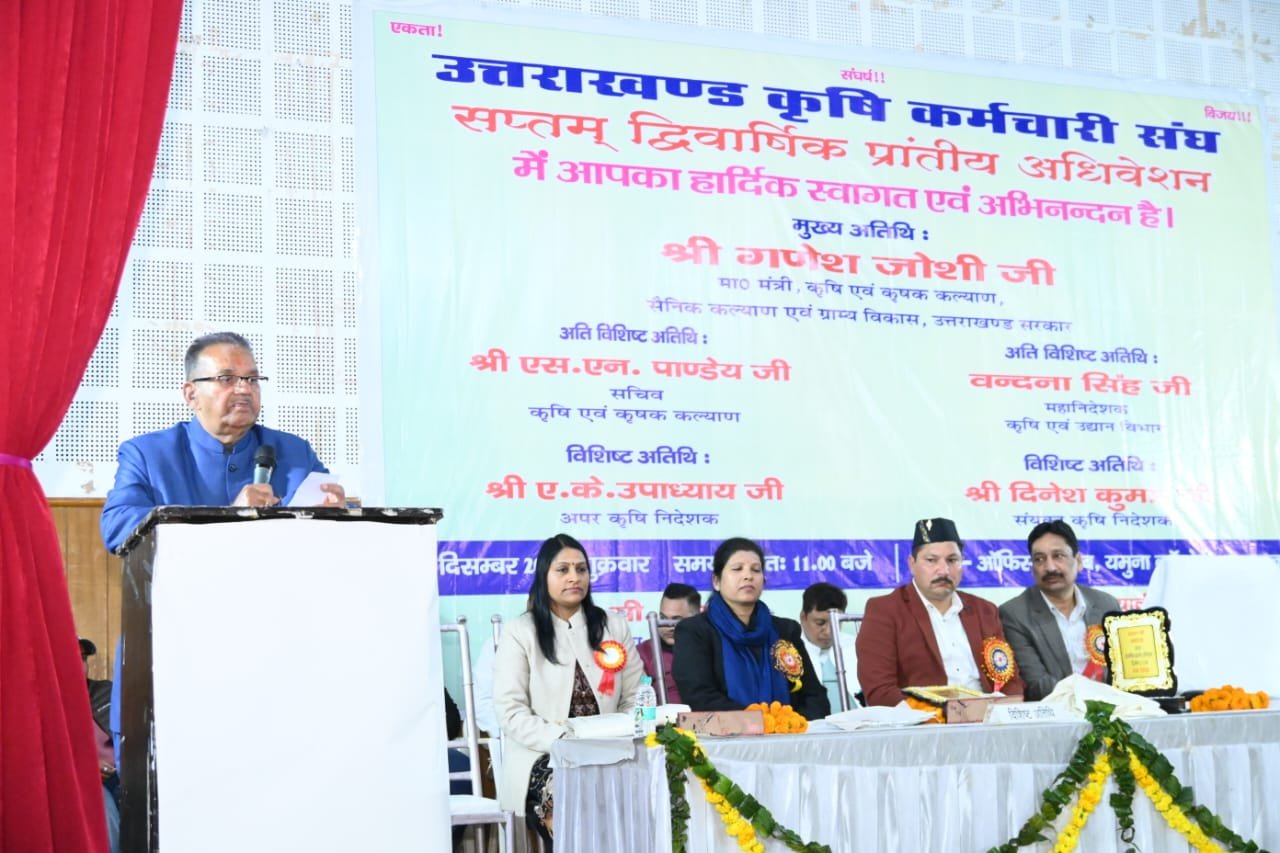 कृषि मंत्री गणेश जोशी ने यमुना कॉलोनी स्थित ऑफिसर्स क्लब में आयोजित उत्तराखण्ड कृषि कर्मचारी संघ के सप्तम् द्विवार्षिक प्रांतीय अधिवेशन में मुख्य अतिथि के रूप में प्रतिभाग किया। कार्यक्रम का शुभारंभ दीप प्रज्वलन के साथ हुआ। मंत्री जोशी ने संघ के पदाधिकारियों व सदस्यों को बधाई देते हुए कहा कि अधिकारी और कर्मचारी किसी भी विभाग की रीढ़ होते हैं तथा जनकल्याणकारी योजनाओं को जमीनी स्तर तक पहुंचाने में उनकी अहम भूमिका रहती है।