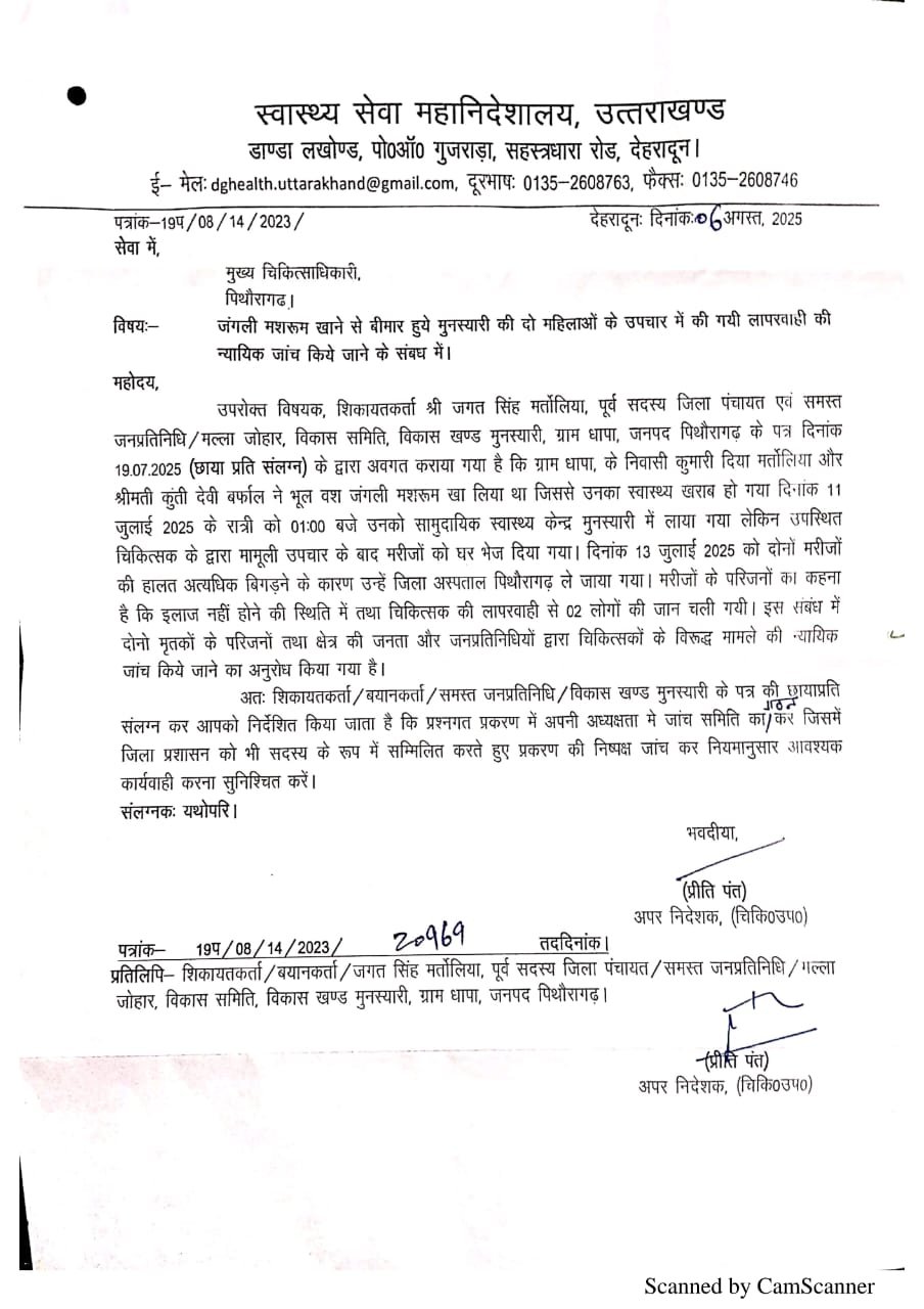 मशरूम खाने से हुई दो मौत के मामले में नया मोड़ आ गया है। स्वास्थ्य महानिदेशालय से अपर निदेशक प्रीति पंत ने इस मामले में पुन: जांच करने के लिए सीएमओ को पत्र लिखा है। उन्होंने कहा कि अब सीएमओ की अध्यक्षता में जांच कमेटी बने। कमेटी में जिला प्रशासन द्वारा नामित अधिकारी को भी रखे जाने की सलाह दी है।