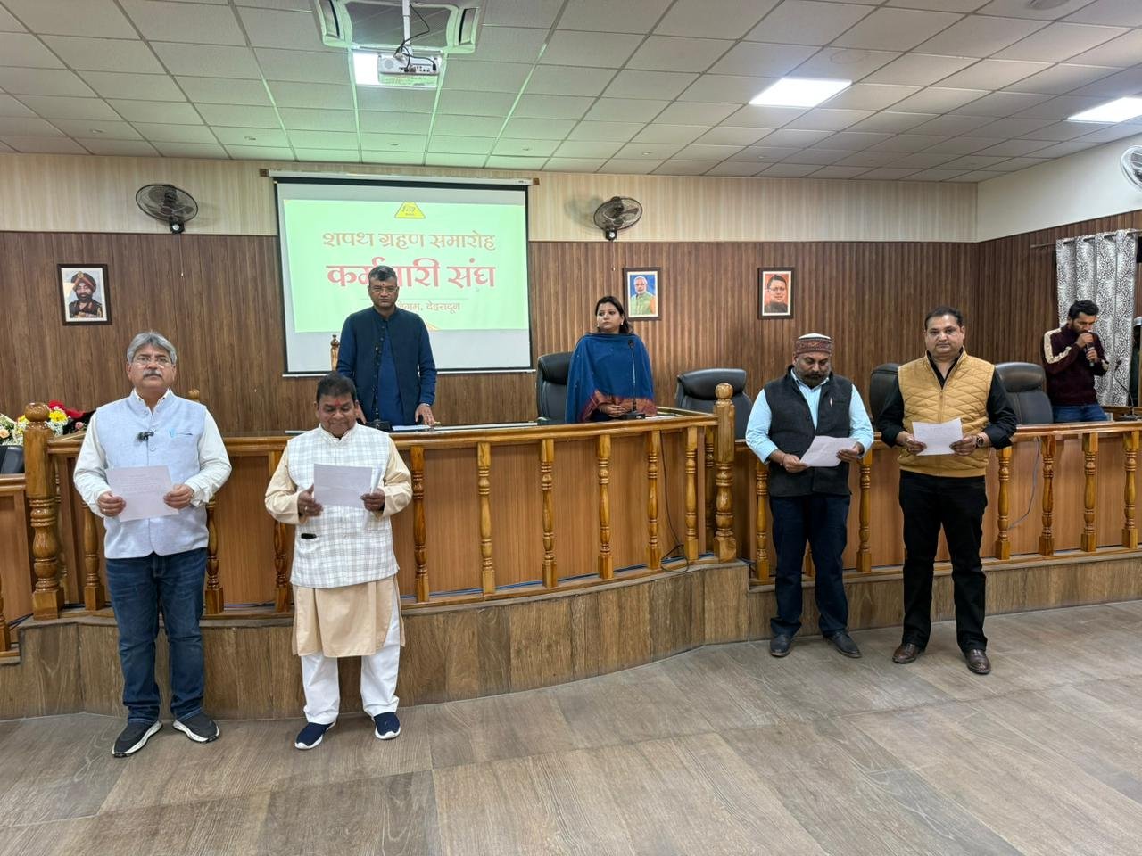 देहरादून नगर निगम कार्यालय में आयोजित शपथ ग्रहण समारोह में सौरभ थपलियाल ने कर्मचारी संगठनों के नवनिर्वाचित पदाधिकारियों को पद एवं दायित्व की शपथ दिलाई। महापौर ने कर्मचारियों को शुभकामनाएं देते हुए कहा कि नगर निगम देहरादून कर्मचारियों के कल्याण और समस्याओं के समाधान के लिए प्रतिबद्ध है।