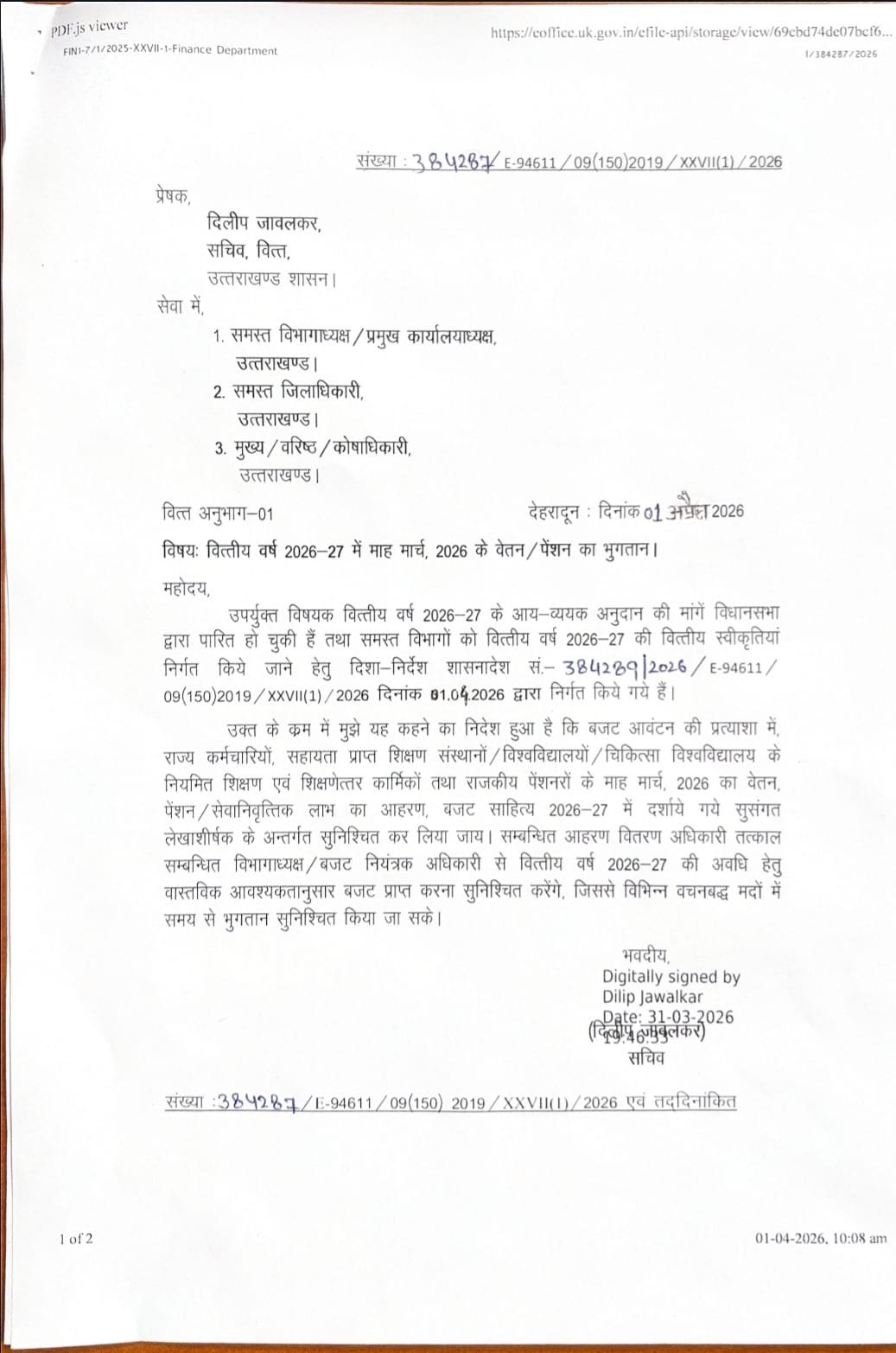 राज्य कर्मचारी संयुक्त परिषद उत्तराखण्ड के प्रदेश अध्यक्ष अरुण पांडे ने जानकारी दी कि वित्त विभाग द्वारा प्रदेश के कर्मचारियों को मार्च 2026 का वेतन शीघ्र जारी करने के निर्देश दिए गए हैं।