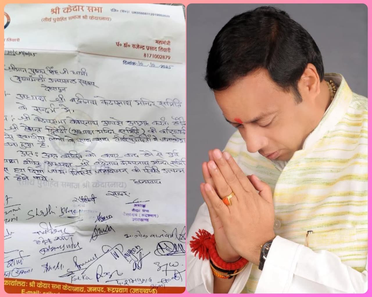 श्री केदार सभा (तीर्थ पुरोहित समाज श्री केदारनाथ) ने मंदिर समिति के अध्यक्ष हेमंत द्विवेदी को हटाने की मांग करते हुए तीखा विरोध दर्ज कराया है। केदार सभा ने मुख्यमंत्री को ज्ञापन भेजकर स्पष्ट चेतावनी दी है कि यदि कपाट बंद होने से पूर्व अध्यक्ष को तत्काल नहीं हटाया गया तो पुरोहित समाज आंदोलन की राह पकड़ेगा।