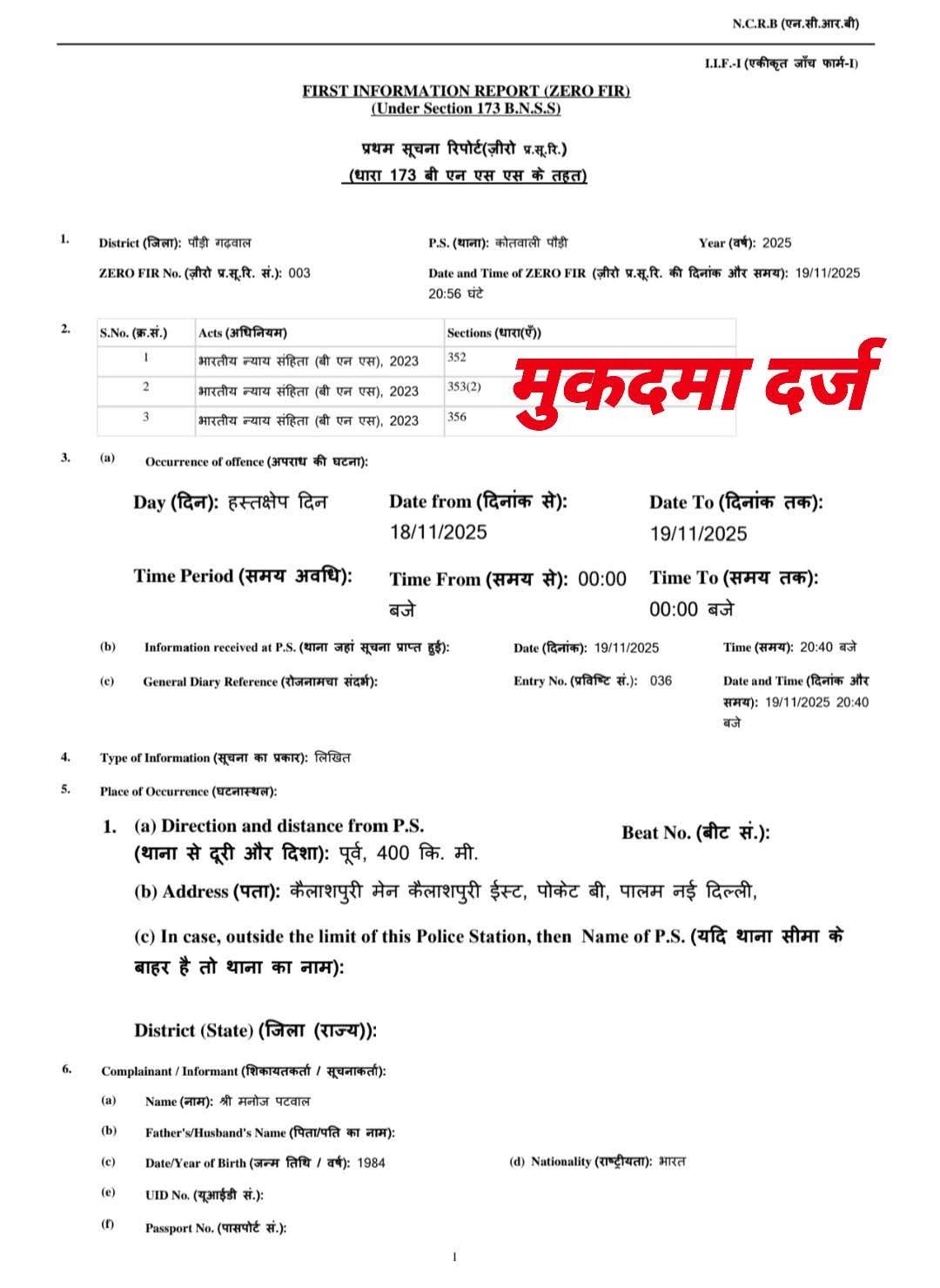 इस संबंध में मनोज पटवाल द्वारा दी गई तहरीर पर पुलिस ने तत्काल कार्रवाई करते हुए आरोपी के विरुद्ध भारतीय दंड संहिता की निम्न धाराओं में मुकदमा दर्ज किया है—