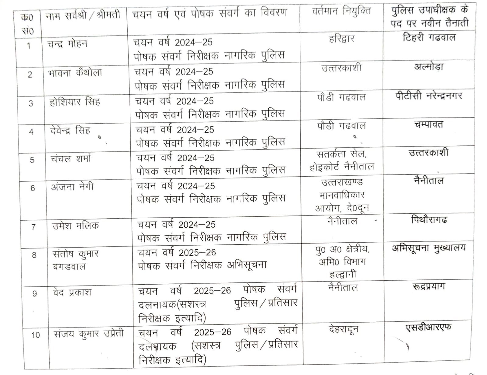 पदोन्नति के बाद चन्द्र मोहन (टिहरी गढ़वाल), भावना कैंथोला (अल्मोड़ा), होशियार सिंह (पीटीसी नरेंद्रनगर), देवेन्द्र सिंह (चम्पावत), चंचल शर्मा (उत्तरकाशी), अंजना नेगी (नैनीताल), उमेश मलिक (पिथौरागढ़), संतोष कुमार बगड़वाल (अभिसूचना मुख्यालय), वेद प्रकाश (रुद्रप्रयाग) और संजय कुमार उप्रेती (एसडीआरएफ) को नई तैनाती दी गई है।