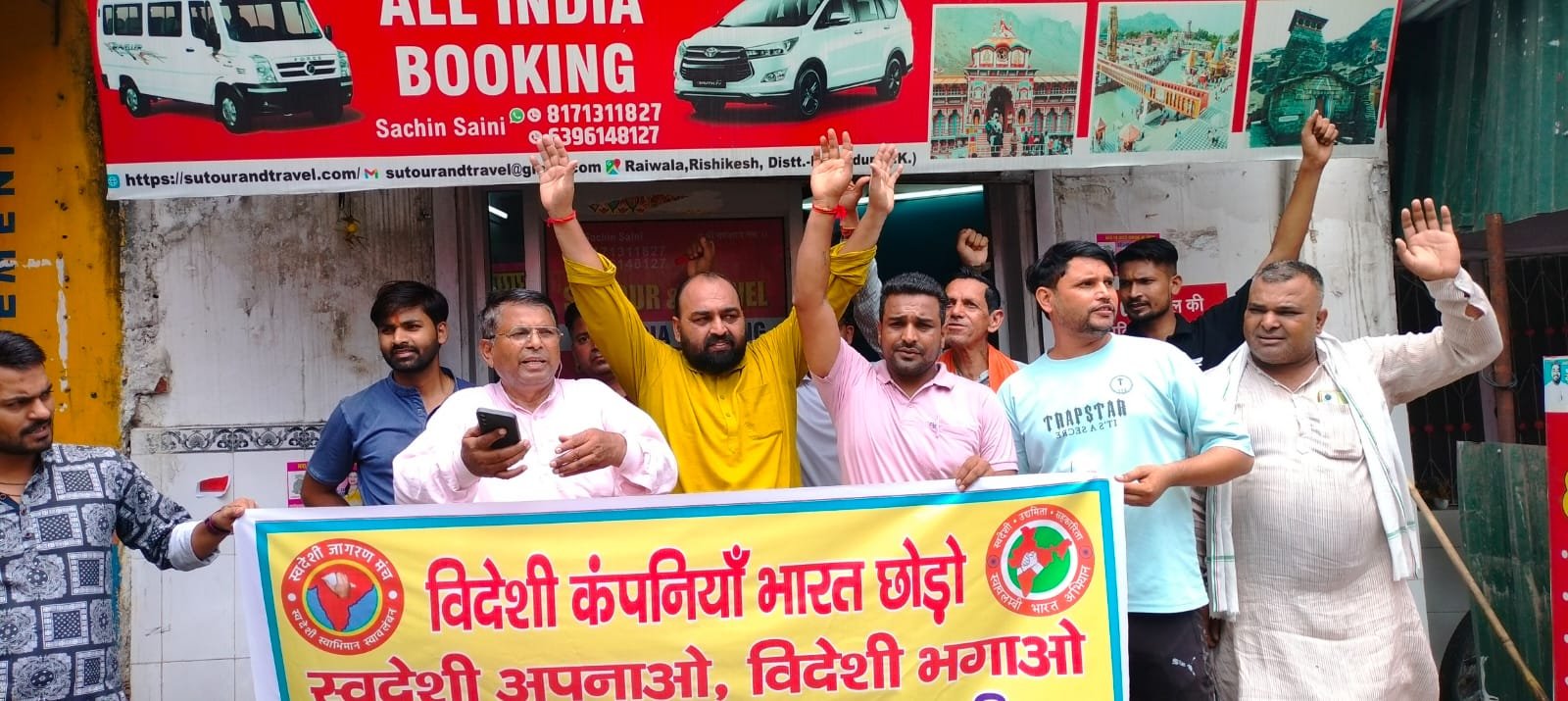 रायवाला क्षेत्र के हनुमान चौक में स्वदेशी जागरण मंच के आह्वान पर व्यापार सभा, स्थानीय व्यापारी, सामाजिक संगठन, जागरूक समाजसेवी संस्थाएं और बुद्धिजीवी वर्ग ने विदेशी कंपनियों के विरोध में प्रदर्शन किया।