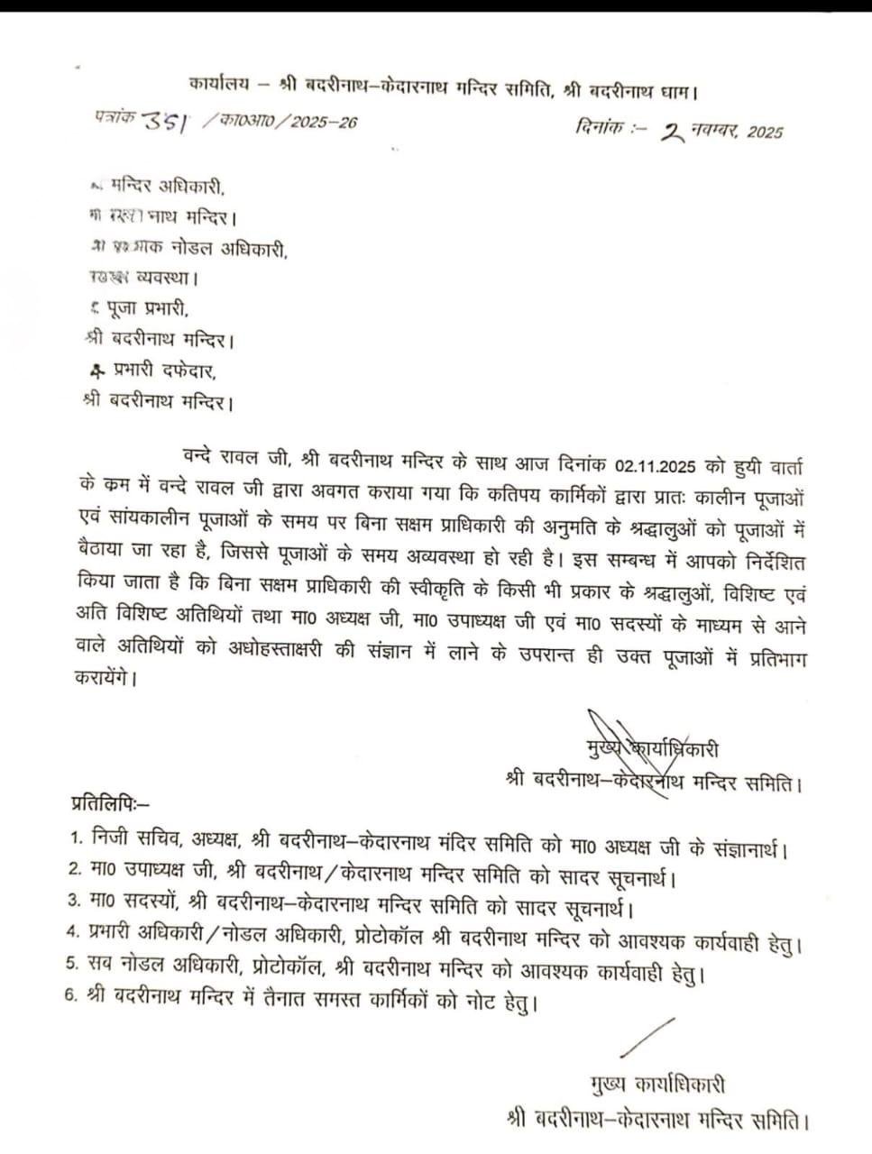 सूत्रों के अनुसार, कई वीआईपी श्रद्धालु बिना शुल्क दिए पूजाओं में आगे बैठ जाते हैं, जबकि शुल्क जमा करने वाले भक्तों को पीछे स्थान दिया जाता है। इस पर रावल ने कड़ी नाराजगी जताते हुए सीईओ विजय थपलियाल से चर्चा की। इसके बाद सीईओ ने आदेश जारी करते हुए स्पष्ट किया कि मंदिर समिति के अध्यक्ष या किसी भी माध्यम से आने वाले अतिथियों को पूजाओं में बैठाने से पूर्व सीईओ की स्वीकृति आवश्यक होगी।