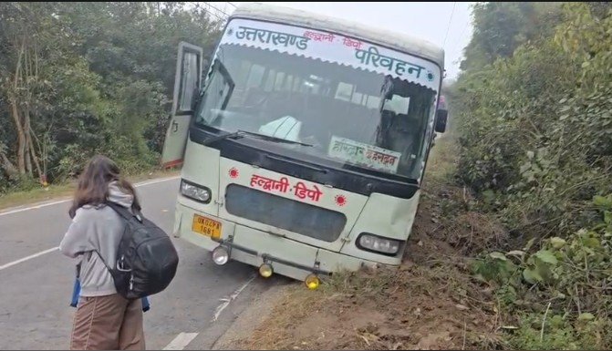हल्द्वानी से रामनगर–हरिद्वार होते हुए देहरादून जा रही उत्तराखंड परिवहन निगम की रोडवेज बस एक बड़े हादसे का शिकार होने से बाल-बाल बच गई। रामनगर के बेलगढ़ क्षेत्र में अचानक सामने आए बाइक सवार को बचाने के प्रयास में बस अनियंत्रित होकर सड़क किनारे कच्चे हिस्से में धंस गई। बस में करीब 25 से 30 यात्री सवार थे।