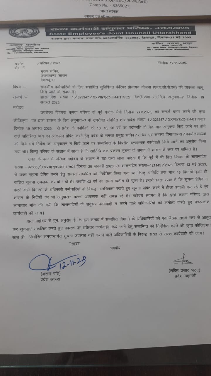 परिषद ने नाराजगी जताते हुए कहा कि वित्त अनुभाग-7 के 19 अगस्त 2025 के शासनादेश के बावजूद अब तक केवल 16 विभागों ने ही सूचना भेजी है, जबकि दो वर्ष से यह मामला लंबित है। परिषद प्रवक्ता आर.पी. जोशी ने बताया कि शासन द्वारा कई बार पत्र भेजे जाने के बावजूद संबंधित अधिकारी लापरवाही बरत रहे हैं, जिससे कार्मिकों का हित प्रभावित हो रहा है।
