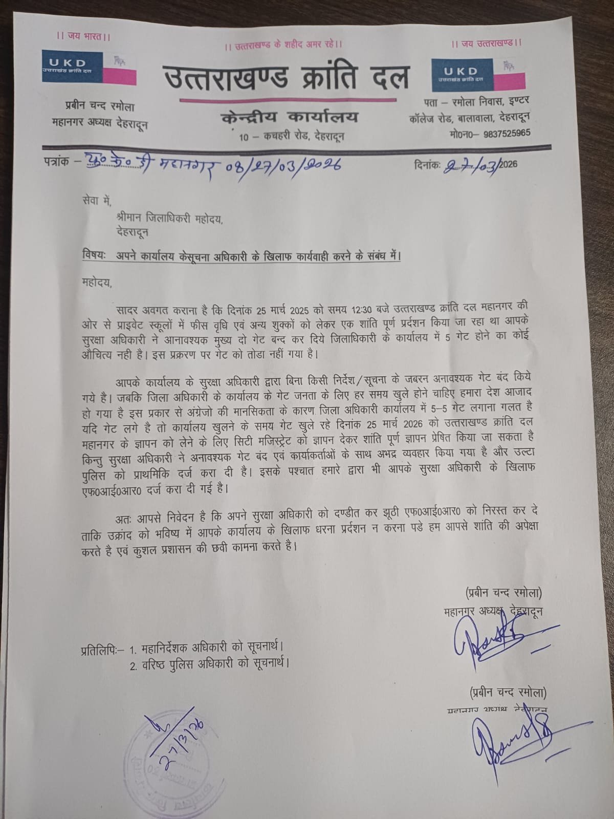 उत्तराखंड क्रांति दल के देहरादून महानगर इकाई द्वारा 25 मार्च 2026 को जिलाधिकारी कार्यालय में किए गए प्रदर्शन के बाद विवाद गहराता जा रहा है।