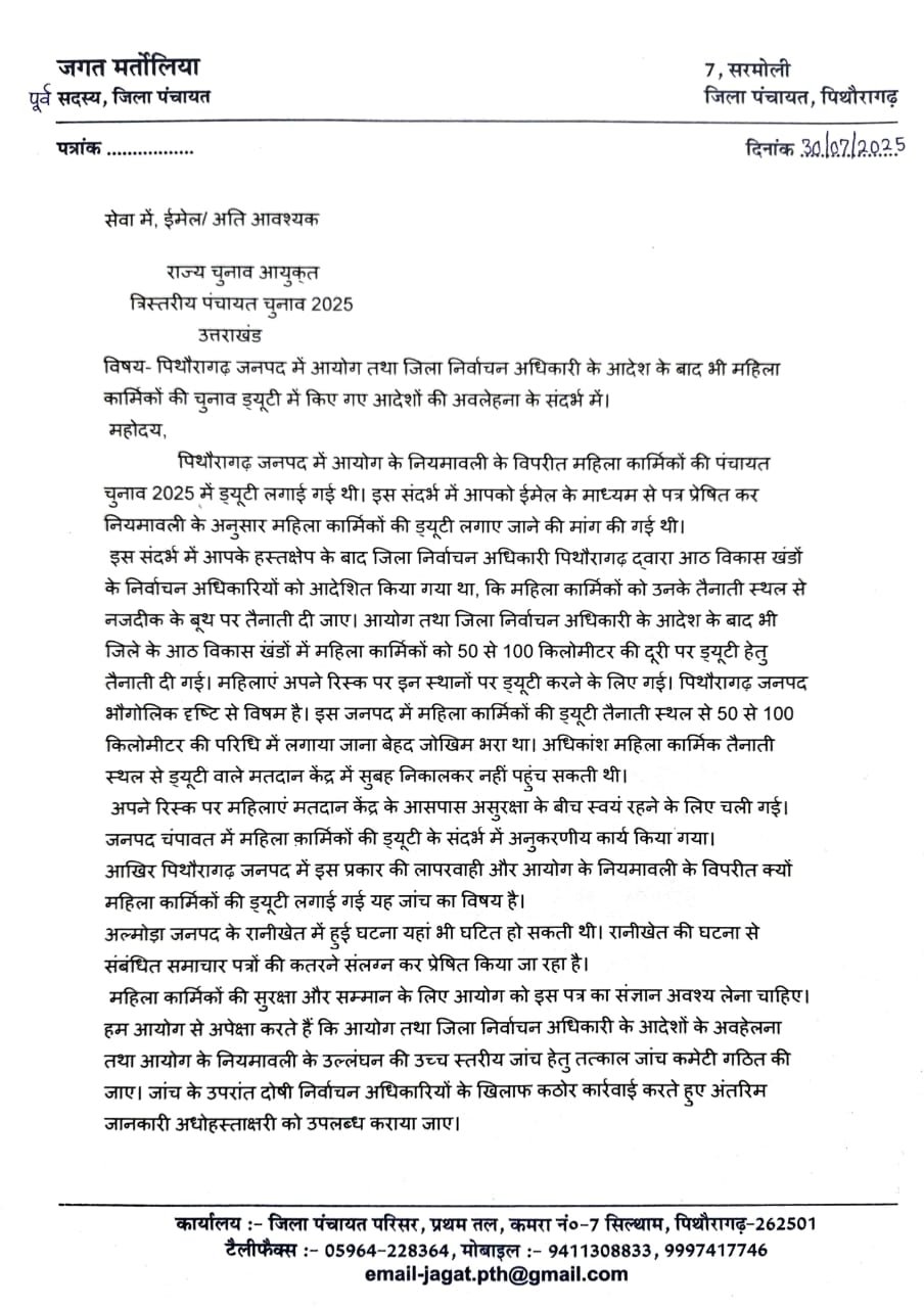 पिथौरागढ़ जिले में हुए पंचायत चुनाव में महिला कर्मचारियों की ड्यूटी निर्वाचन आयोग की नियमावली के विपरीत लगाए जाने का मामला सामने आया है। पूर्व जिला पंचायत सदस्य जगत मर्तोलिया ने राज्य निर्वाचन आयोग से इसकी शिकायत करते हुए दोषी अधिकारियों पर कड़ी कार्रवाई की मांग की है।